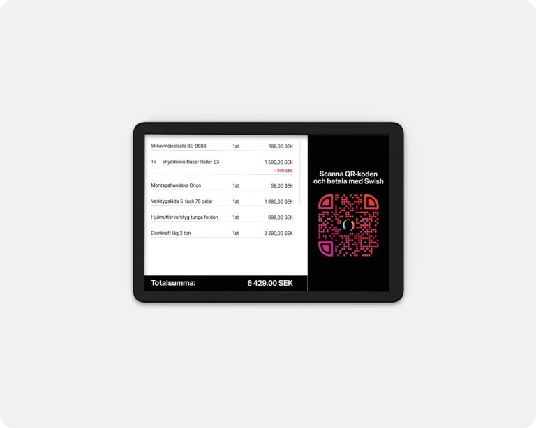 Benytt deg av Swish for å motta betaling både i butikken og på nettet. Swish er svenskenes Vipps og fungerer på samme måte: Kunden skanner bare QR-koden som vises på skjermen deres. Ved å la kunden gjøre jobben selv, kan de ansatte fokusere på en vennlig dialog.